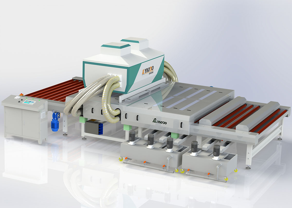 用于匹配雙邊磨使用;進(jìn)片段有兩道預(yù)噴淋,減少帶入主機的玻璃粉,減少玻璃粉對設(shè)備的腐蝕,延長設(shè)備使用壽命;PLC控制系統(tǒng),配有編碼器等傳感器,可通過設(shè)置相應(yīng)的厚度和速度,控制系統(tǒng)可自動控制;水路部分有多重過濾,盡可能的保持噴淋到玻璃表面的水的潔凈度;噴淋管安裝有大量噴頭,噴頭型號為9515,噴射出的水為扇形,可有效覆蓋全部玻璃,無死角,且噴頭口較大,不易被玻璃粉及其他污染物堵塞;毛刷電機使用減速機,輸出扭矩大,避免小皮帶輪帶動大皮帶輪,減少傳動皮帶的打滑和磨損,延長皮帶使用壽命;毛刷材質(zhì)為尼龍絲材質(zhì),轉(zhuǎn)速500r/min,能更有效的清潔玻璃表面污染物;一道上毛刷材質(zhì)為尼龍0.08mm的,清洗LOW-E玻璃時使用且不劃傷膜層;配備有3對風(fēng)刀,風(fēng)刀使用鋁合金一次成型,變形小,刀口均勻誤差小,保證刀口間隙誤差小于±0.2mm,更好的吹干玻璃;風(fēng)機箱安裝在設(shè)備上架上方,能更有效的節(jié)約廠房空間;風(fēng)機箱